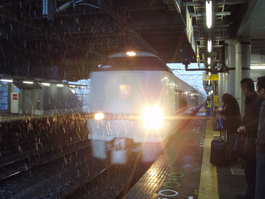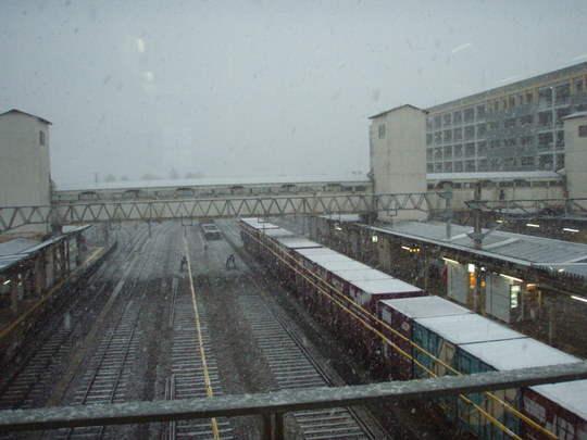 福井を越えたあたりからちらちらと雪が降ってます。金沢では本降に。