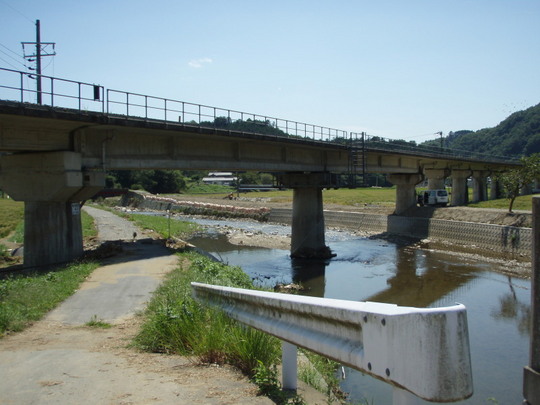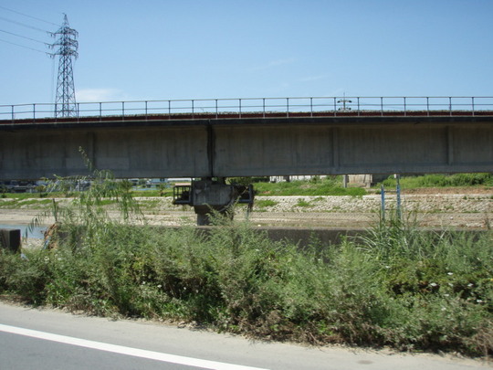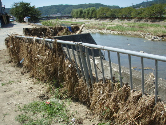 橋脚の上に引っかかる草や道路の安全策にかかる草の位置などから洪水のすごさを感じます。