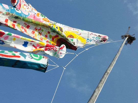 それを吹流しのように風にあずけると、その風に乗って子供たちの思いは遠くの被災地にとんで行きます。心のこもった壮大なアート。アートの中に刻まれたメッセージ。素晴らしいです。