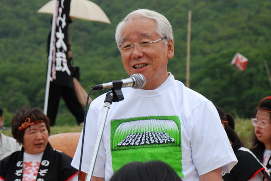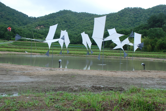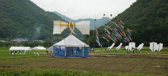 水田に映る風のシンフォニーを白影の光る神の紗をモチーフに造形されておられます。並ぶ鯉のぼり?はよく見ると鯉のぼりではなく地元の児童が、そして百歳を迎えられた方々が、新宮さんと一緒に震災で被災された方々に送るメッセージを自由に心から書き上げたものだそうです。