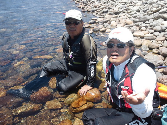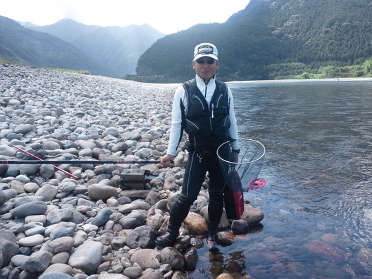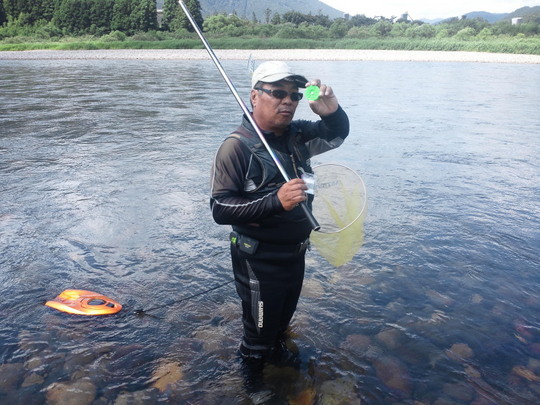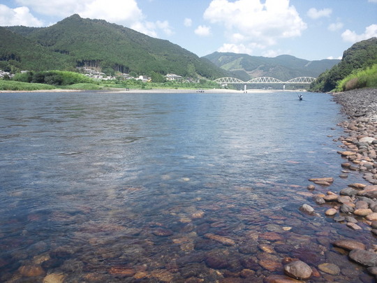 いつもいろいろ教えていただいている長谷川さん、東山さんはいろいろ気を使ってくださいまして本当にありがとうございます。我々が三和大橋のすぐ上手の食堂に入っている間もポイントを探していただき本当にすみませんでした。電話で○ッさんから電話が入りました。「熊野どうなん?」正直に伝えました。「悲惨」と。これはずっと続いていた十津川の発電放水をやめ、ずッと高かった水位が一気に下がったため、異変を感じて隠れてしまったか水温の急激な変化で大量に死んでしまったか。・・・情報によると「敷屋」の方がいいとのこと。残念ながら組合の区域がちがっていてそちら方向には行けず。