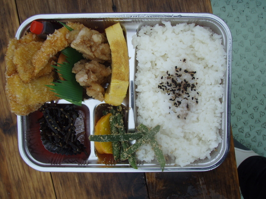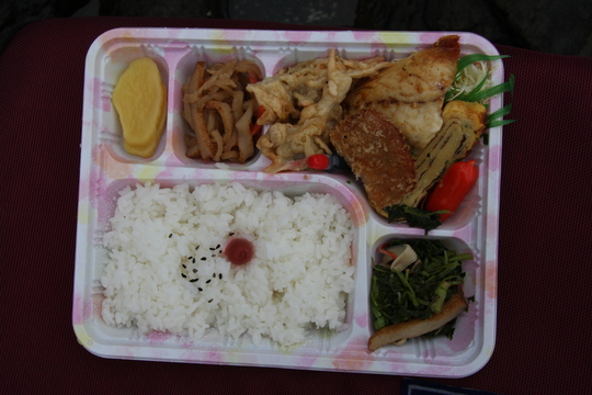 見老津のお弁当。こっちも華やか。味付け良く優しい感じがした。枯れ木灘はこんな感じのが多いみたい。 |