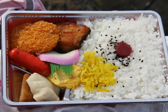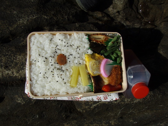 梶賀のお弁当。磯からほおり投げても型崩れしないびっしり詰まったおかず。 |