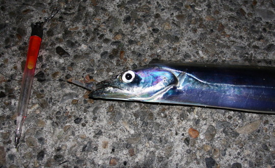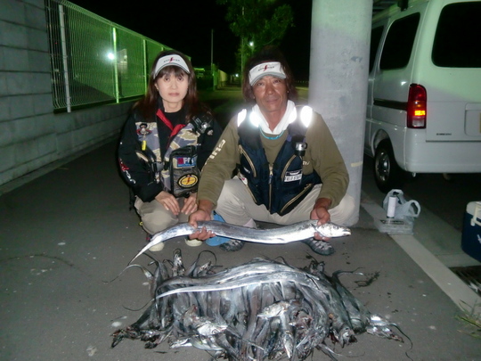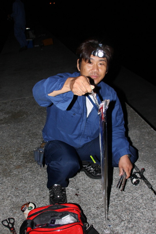 ドジョウ12匹で92匹の太刀魚です。何やら秘策があったと聞きましたが、言いつけどおりどぜう一本やりの引き釣りを頑張った見ました。ところがここの太刀魚はセオリー通りにはいかず、柔らかいサンマの切り身に多く反応していたようで、かたいどぜう一本の私には何のあたりもありませんでした。