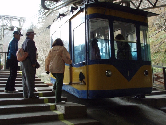 普段ならこの時期すでに桜はロープウェアのある下千本では満開で、桜のトンネルをくぐって約380m の距離、高低差にして105mを一気に上がるとそこにはたくさんの桜が待っているはずでした。しかし今日は残念ながら少し早かったようです。しかし日本で一番古いロープウェイ。支柱は昭和3年。初代ロープウェイは昭和4年ということです。すごい長持ちですね。
