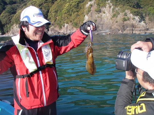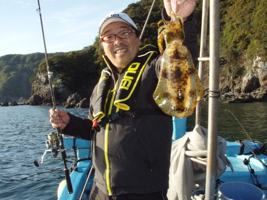 「ここらの下の方ならきっといますよ」と松ッちゃんがいうので、極力そこにキャストするも、流されて船が近づきすぎて、なかなかエギを落ち着かせるのが大変。