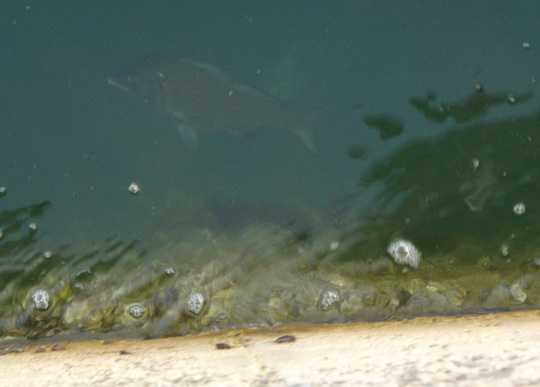 カーフェリーが発着する港で護岸の水深1Mくらいのところを悠々と年なしのチヌが泳いでいます。