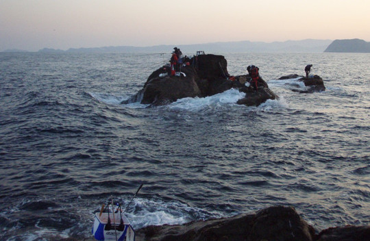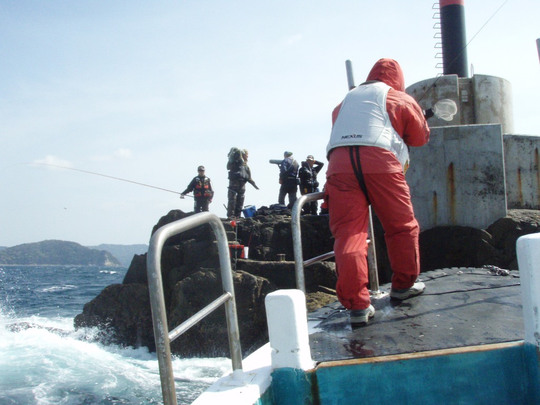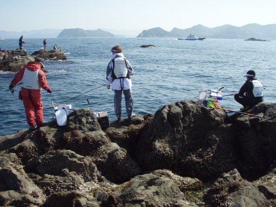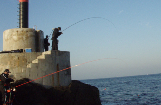 ハリスが魚から見えているのかいないのか、極力きれいなまっすぐな糸を傷つけないように海にほおります。魚と人とを