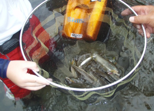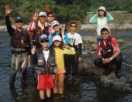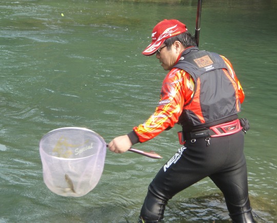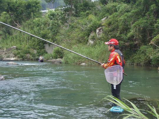 何しろ朝は鮎釣り、おとりを松本さんが持ってきていただいて、白石の瀬の下にアタる「曲がり」という場所でやりました。