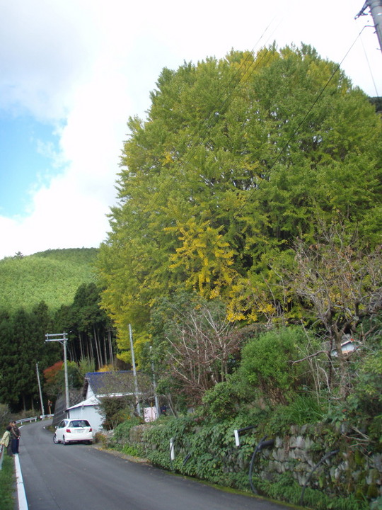 もともとモンドセレクションで金賞を取ったという梅ぼしがあるということでの寄り道だったのですが・・中辺路まで40Km。これはぜひとも行かねばならぬ。こんな心境でひた走らせます。ひと際大きく目に飛び込んできたのが、福定の大銀杏。デカイ。雄大。すごい。見物する人も多い。その大銀杏も熊野古道に面しており、どこかさびた情景がある。