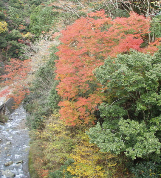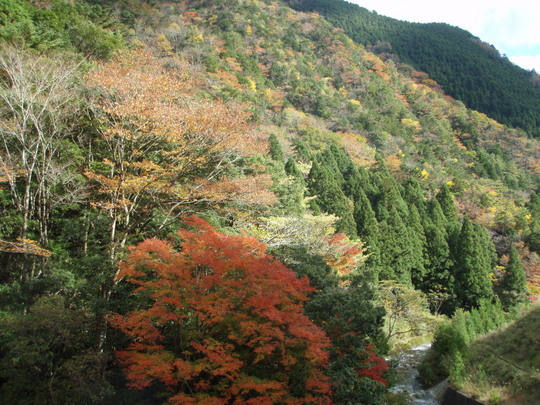 ちょっと行くと富田川沿いの道からきれいな紅葉が迫ってきます。