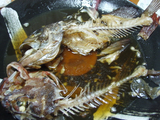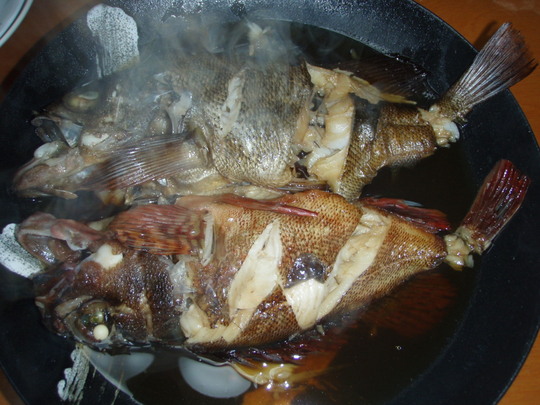 うちのカミサンが釣ったガシラと一緒に乗り合わせた方から頂いたメバル(私の視線がメバルにくぎ付けになっているのを見かねて分けてくださったと思う)。