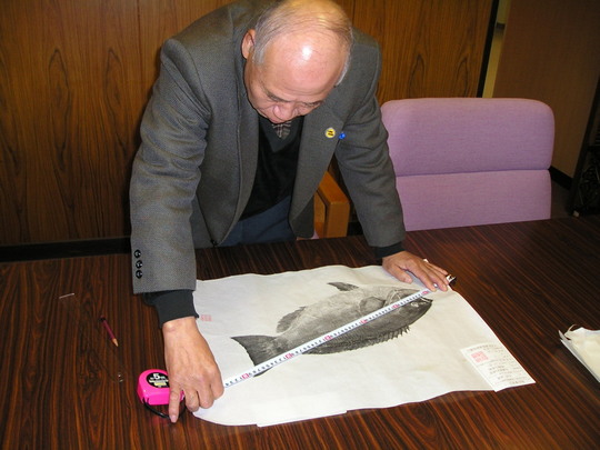 日釣連(日本釣連盟連絡協議会)では毎年前年の10月、11月、12月と3ヶ月間にわたりその間に釣れた魚の魚拓を釣り人にとっていただき、年が明けて1月の第2週にそれら応募エントリーのあった魚拓の寸法を再度厳正に測定して、魚種別に大きさを競う大会を行っています。