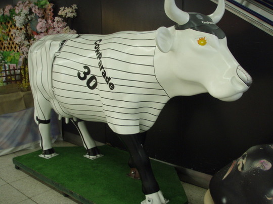 駅の中には阪神タイガースを思わせる縦縞の牛がいました。