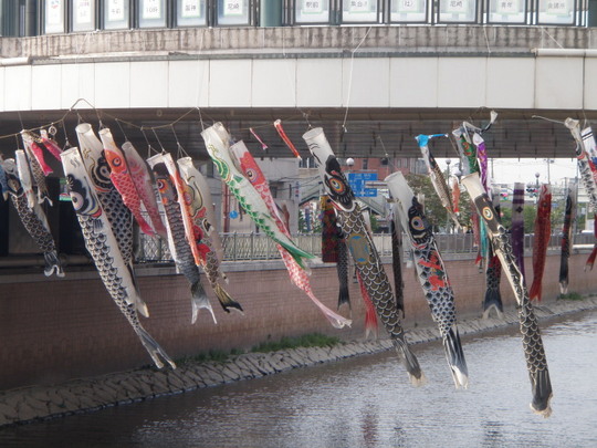 帰り道、阪神尼崎の駅がまたがる川の上に、鯉のぼりがありました。
