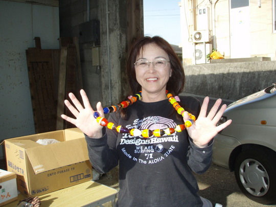 今回は泉南〜和歌山ライブショットの葛城修平さんの自称お弟子さんで大西満里子(MAKO)さんが見事ジャンケンで勝ち残りお値打ち品のウキの首飾りをゲットしました。イイナイイナ!