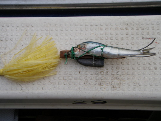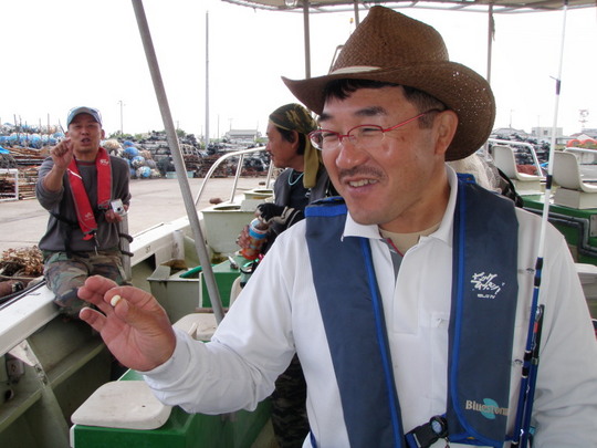 お世話になった丸松乗合船さんで準備してあるイワシを使ったタコテンヤで狙ったそうです。ヒラヒラと動くものがあって色によってアピール度が違うのかもしれませんが、知っているのはタコのみ。生の手羽先に乗ってきたと今井さんも書いていましたし、カミサンの目撃情報では、なんか豚の脂(関西ではカス)らしきものでも釣っていたらしい・・