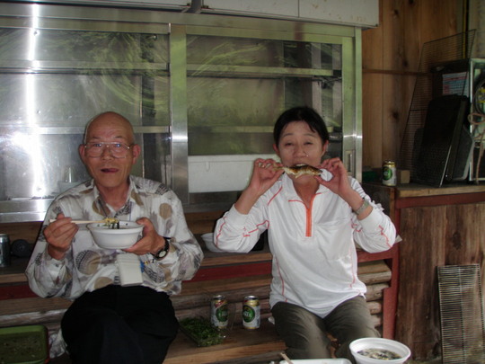さて清流会では午前中にアユ釣りをやって、みんなで雑炊の準備をします。いつも天理にある「淡水」というウナギ専門店の御主人が丹精込めて出汁やら蓼酢を相伴していただくのですが、今年は担当の伊達さんが味付けをすることに。