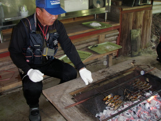でもその雑炊の前に型のいい天然アユを皆さんに食べてもらいます。天然アユは事前にオトリ店「花子」さんにも協力を頂いて50匹ほど確保しておいていただきます。