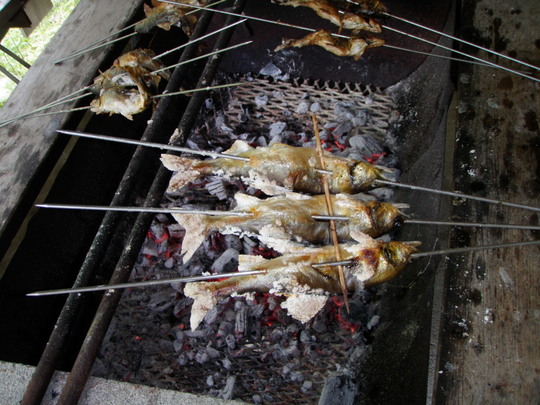 アユは香ばしくなるまで油をためた状態でこんがり焼きます。