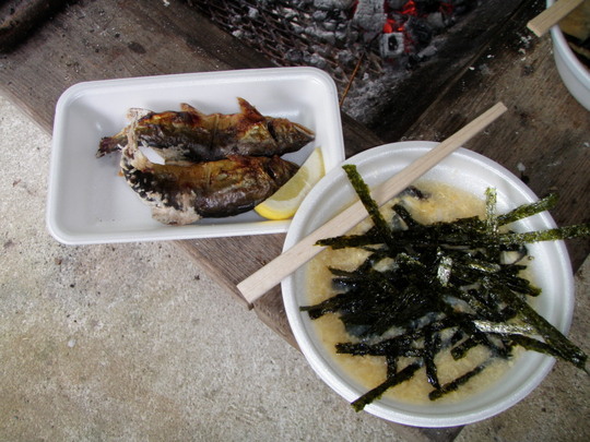 雑炊のアユともどもきれいに脂抜きをしながらアユを焼き、蓼酢でみんなにふるまいます。