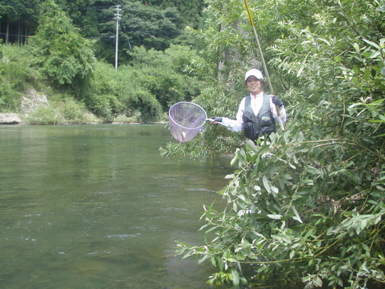 人が移動していく場所があって、理由は「釣れない、掛からない、追わない」とのことです。その場所をしばらく見てみてみると、鮎は結構います。「ここでやろう」とカミサンに言って、約1時間行脚してやっと竿を出しました。