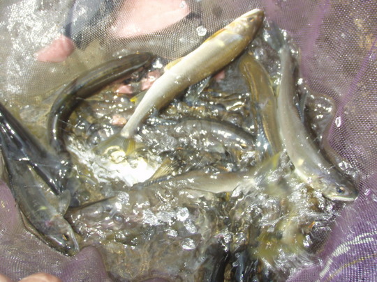 気を入れ替えて「カミサンに場所代わろう」と促し、うろうろ見て回りました。本流の出会いのところは竿の出しづらいところに関しては鮎が見えます。