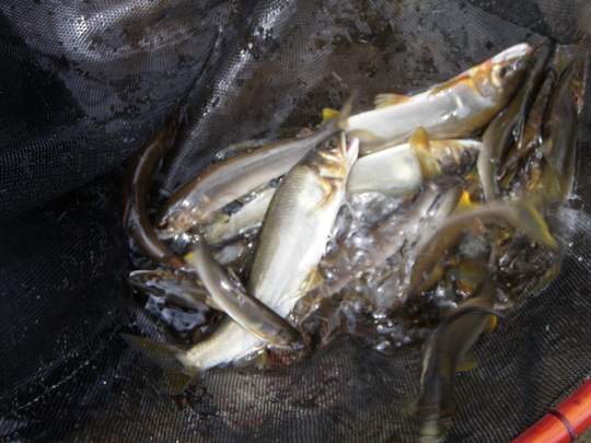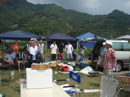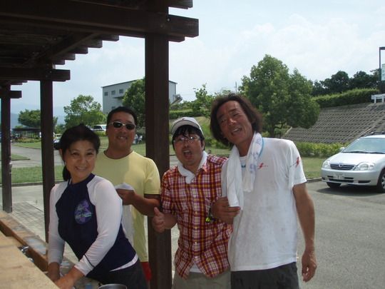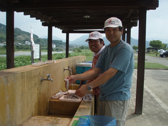 BBQ会場からほど遠くなく皆が同じような釣り場を味わえるように、金谷の駅裏に行くことにしました。朝からストレッチの地元の方に「釣れへんで・・」と初っ端に確実な情報を頂きました。しかしそこは精鋭たち。ビール持参の田阪さんは見ている間に2匹を。鮎50匹持参の竹田さんは予想とは反対のトロ場へ。松尾さんは目の前の大石をしつこく攻めてます。後から竿出しのBIG伊達さんは私の言った通りに上へ。最後にカミサンが投げ釣りの大阪サーフ伊達さんと瀬落ちへ。一時間後、他のメンバーが到着。オトリをいただき早速みんなの釣り場へ。遠めに見ていると初めて竿をだすサーフ伊達さんが真剣。鮎釣りにハマりつつあります。しばらく釣って頂いている間食材の管理のため私と山崎夫人は少しドライブ。山崎旦那は前日大引で40オーバーのグレ釣りに行った後、金屋で一泊。(グレは厳しかったらしく、シイラが湧いていたと・・)