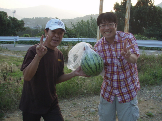 高速も最後まで2車線になって渋滞知らず。楽しい話を車でしていたら、夜明け前に到着してしまいました。遠くは岐阜(恵那)、名古屋、三重、から来てくれる我がBIGフィッシングクラブの精鋭たちと待ち合わせは岡本オトリ店で6時前に。ご主人に立派なスイカを頂きまして「ありがとうございます」。岡本さんから「有田川を景気付けてくれ」と言葉を頂きまして、感謝です。