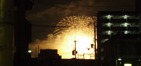 淀川花火大会には間に合わず・・・大きいのが遠くからでもうかがえる