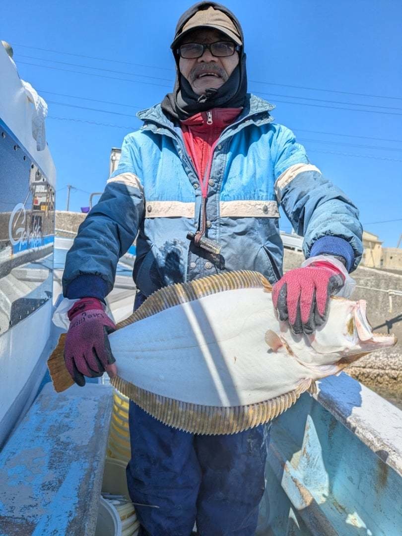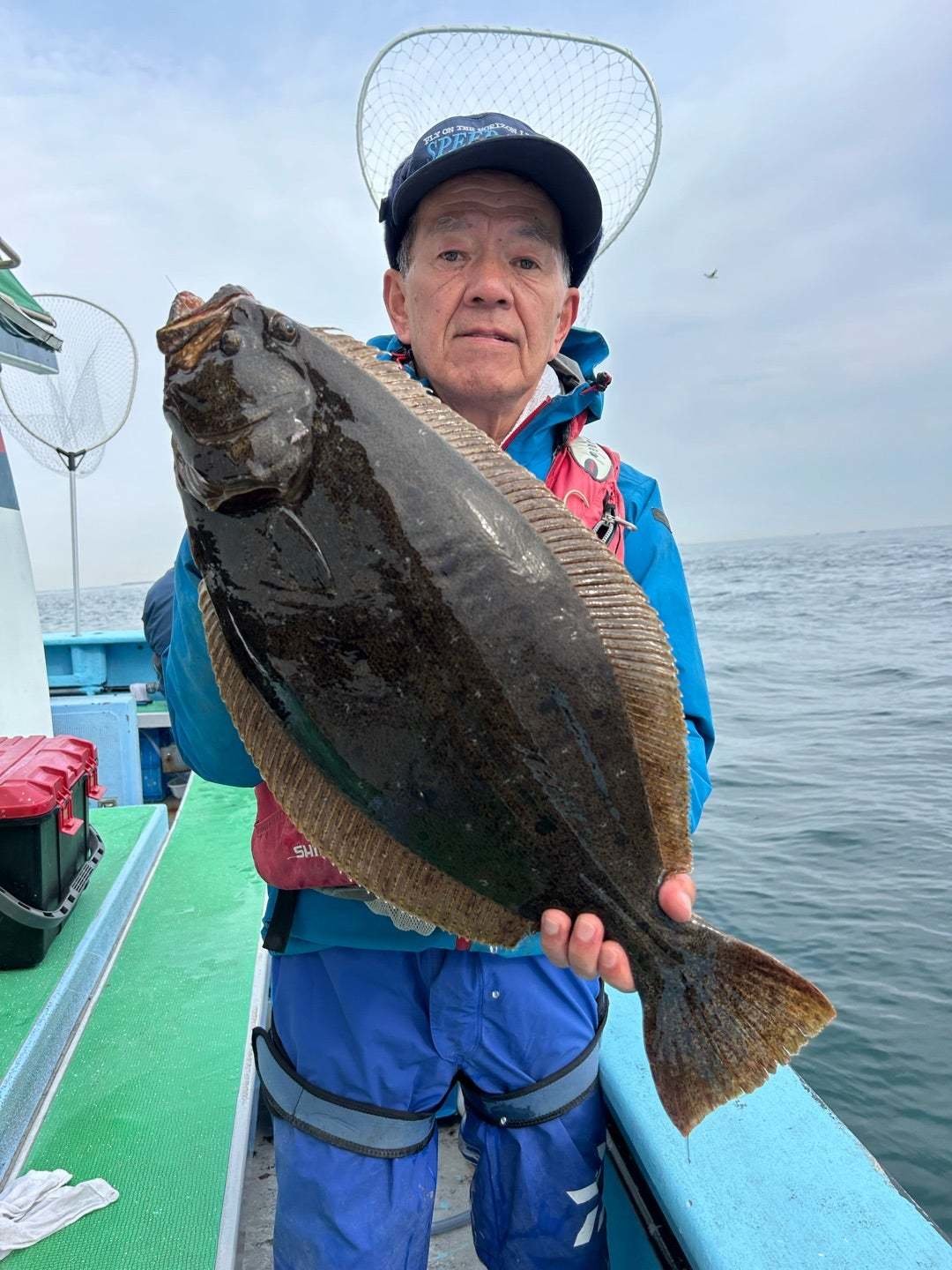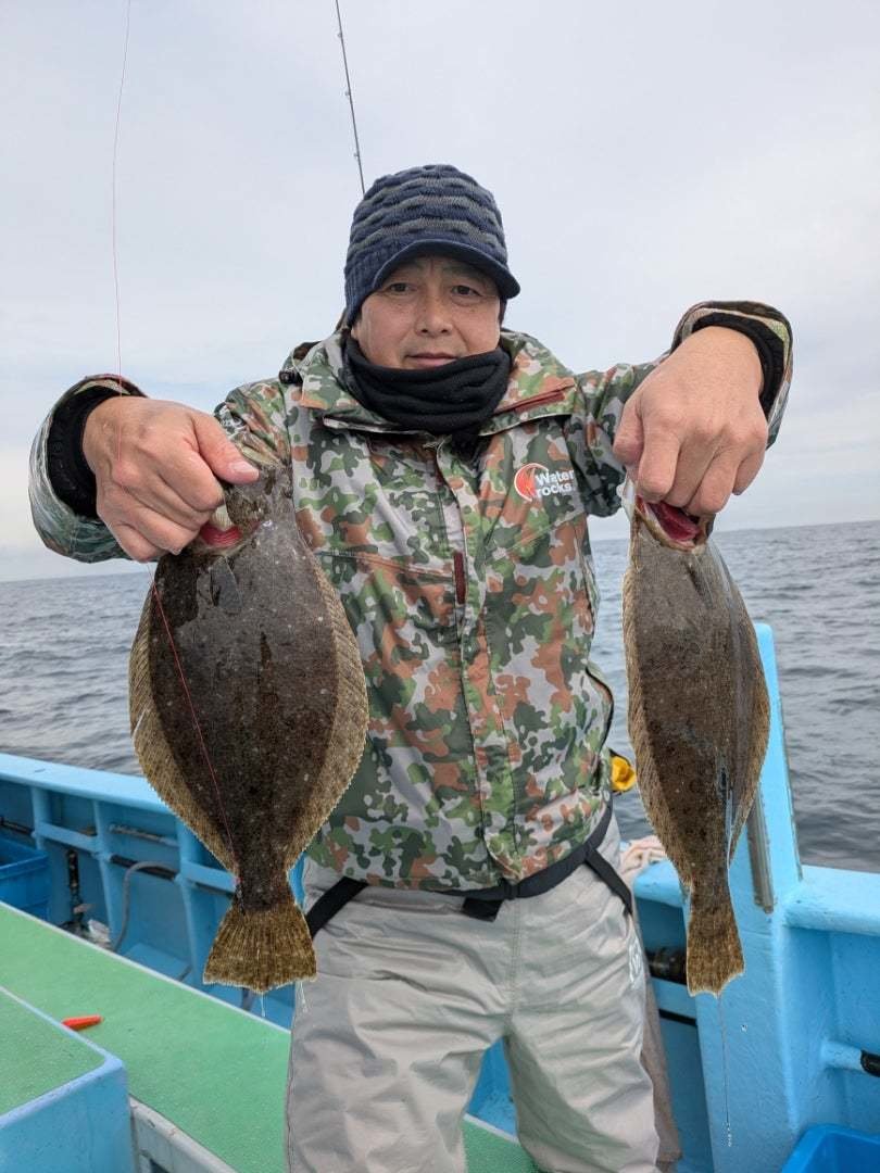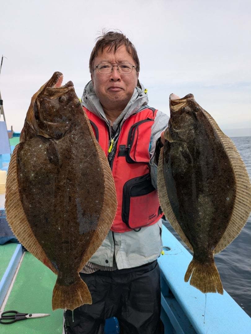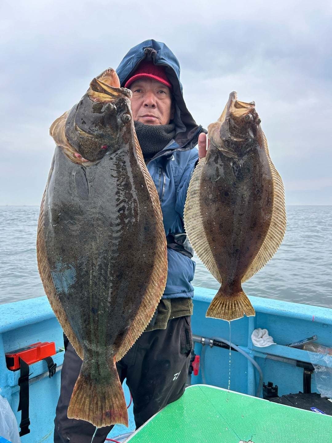 6時〜12時までヒラメ、青物狙いです。 イワシの泳がせ一本針、孫針付きハリス8号オモリ60号エサイワシ。 菰野町の佐々木氏ら3名の乗合。 ヒラメ42〜60cm0〜2枚船中4枚。 その他カサゴ。