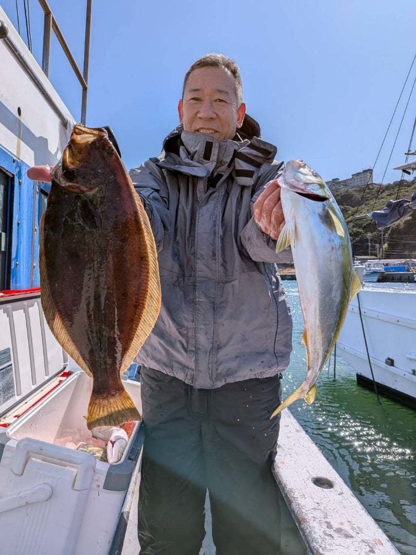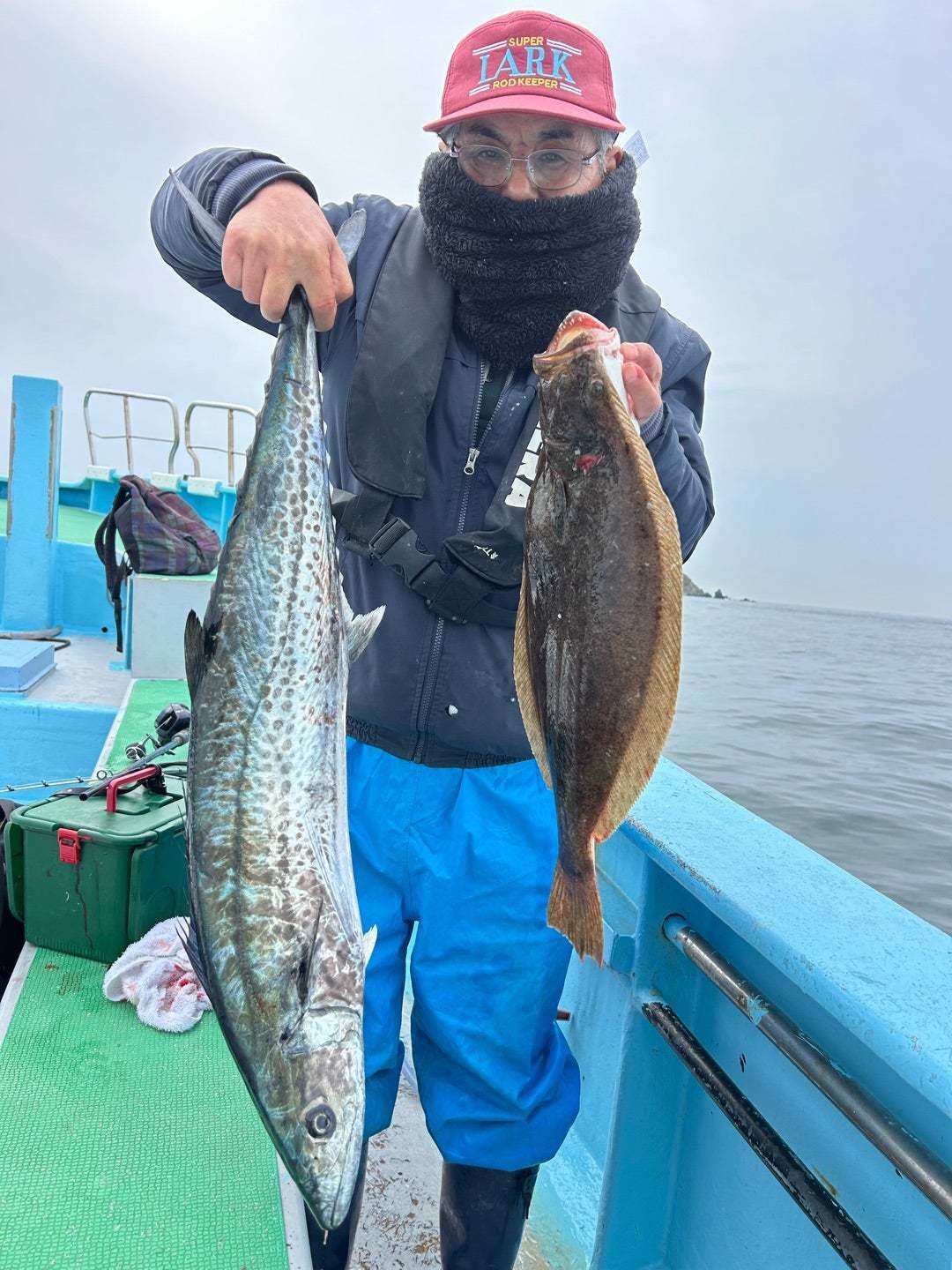 7時45分〜15時50分までヒラメ、青物狙いです。 仕掛:イワシの泳がせ一本針、孫針付きハリス8号オモリ60号エサイワシ。 大垣市の小林氏ら2名の釣果。 その他カサゴ、アオハタ、ホウボウ。 北西の風が冷たく吹いて寒い日でした。 小さなベルト反応が散らばってありましたが、魚のアタリが少なくて釣果は悪かったですね。