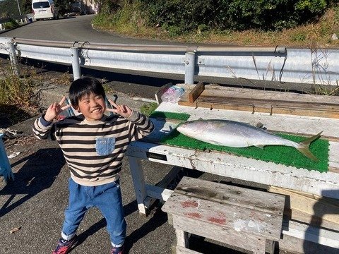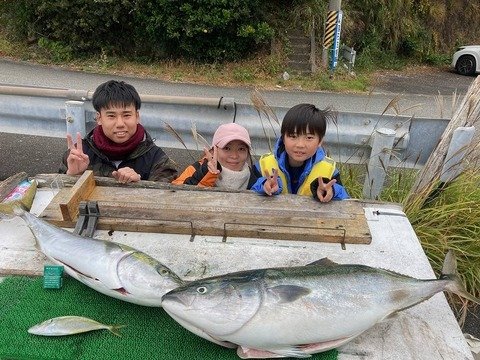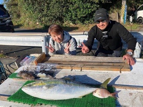 兵庫県からお越しのミッちん&豊田さん親子。 ブリ1、ハマチ1、ツバス1、イワシ餌使用の完全フカセ。 その他アジの泳がせにてアオリイカ700g(ビニール袋)。
