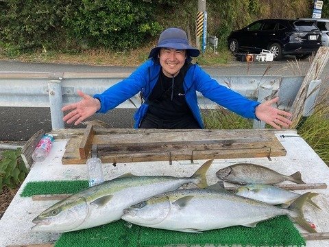 名古屋からお越しの櫻田クンら、ハマチ〜ブリ、コロ鯛など…。 イワシ餌使用の完全フカセにて…。