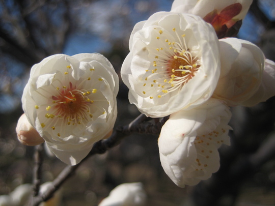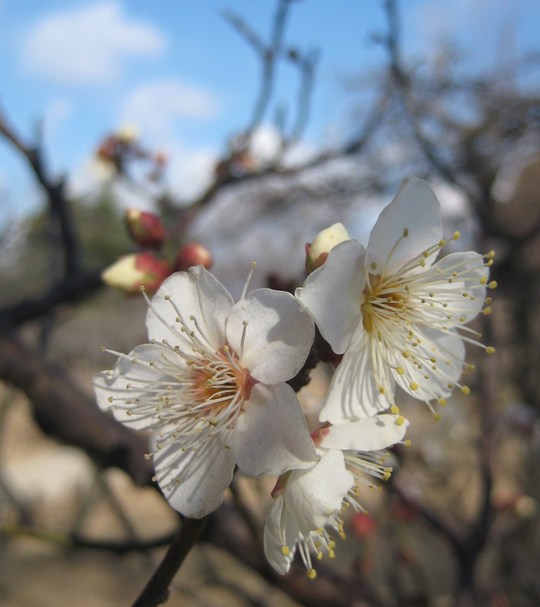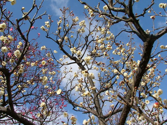 例年、見ごろを迎えるのは2月半ばですから、まだ早いとは思ったのですが…。公園内では、まだ人もまばらで大半の木が3分咲きまでもいっていません。それでも開花している白梅と紅梅を見つけて写真に撮りました。この分では、見ごろは2月半ばからになりそうです。