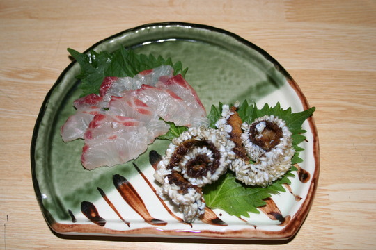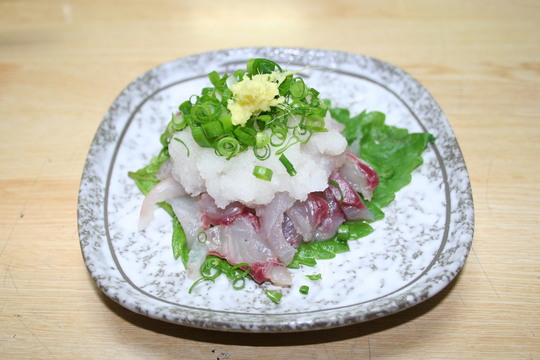 お造りの横の料理は、叩き風味です。平造りにしたイサギの身に大根おろし、刻みねぎ、下ろしショウガなどを添え、ポン酢をぶっかけていただきました。オリーブオイルを少したらすとカルパッチョ風にもなります。普通のお造りに飽きたとき、試してみてください。