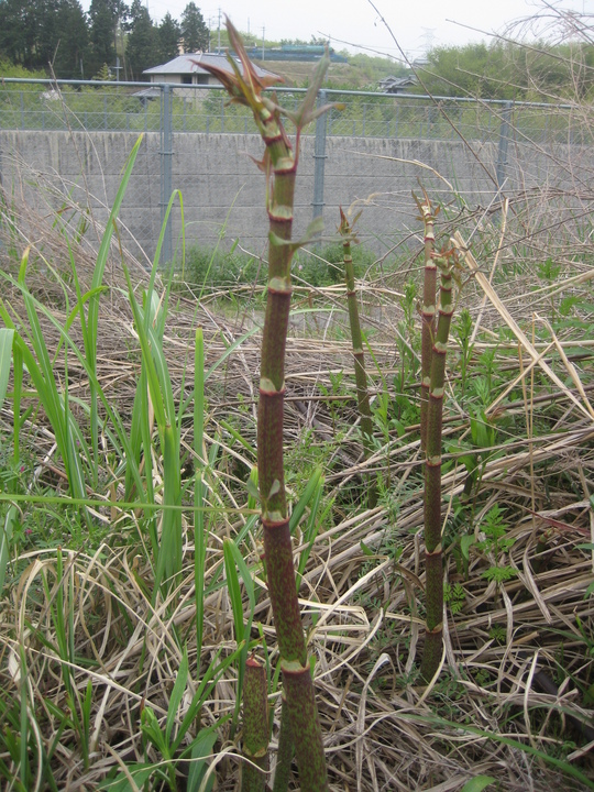 代表的な春の山菜のひとつなので、古くから各地で食べられていたんでしょうね、呼び名も様々です。秋田県ではサシボ、山形県ではドンゴイ、広島県ではカッポン(これは何となく意味がわかります。折ったときにポンと音がするからです)、岡山県ではサイジンコ、宮崎県ではサトガラなど。僕が子供のころはスイバとかスカンポと呼んでいました。漢字で虎杖と書くのは、虎の尻尾のような模様をしているからでしょうか?。生食できるのでのどが渇いたときに、イタドリを折って酸味のある汁をよく吸ったものです。