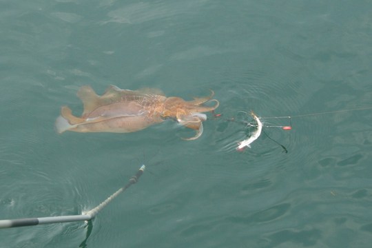イカも大きくなると余り走りませんね。ときには居食いのようなアタリのときもあります。1kgぐらいの奴がよく動くので面白いのでは…。