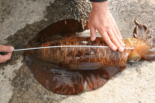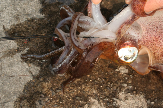 その1時間後、僕にも2kgクラスが来て、ようやく溜飲を下げたのですが、どうしたことかヤエン釣りの師匠である池田さんにアタリがありません。一人ボーズで帰るのは嫌だと粘りに粘って、納竿寸前に待望のアタリが…。イカが乗ってしまえばこちらのものと、楽々取り込んで、全員が型を見たところで目出度くお開きとなりました。