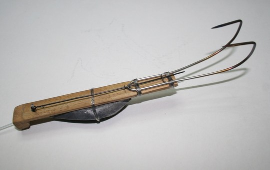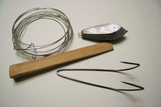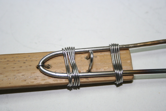 ボディにする竹を削り、天秤のステンレスの針金を曲げて先端を削り、掛けバリを作ります。それぞれのパーツを針金で縛り、最後にエサを固定する針金をとりつけたら完成です。