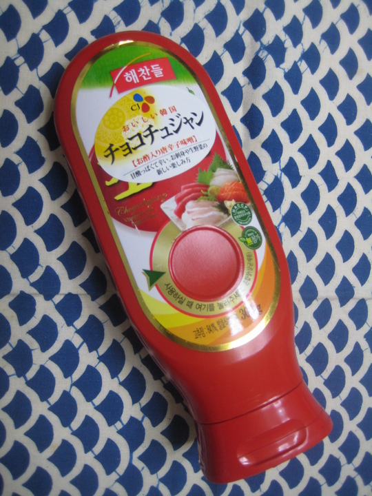 和歌山県の椿へアカイカ釣りに出かけたとき、釣り仲間の近藤さんからコチジャンのような甘辛酸っぱい韓国の調味料をいただきました。ラベルにはチョコチュジャンと書いてあります。