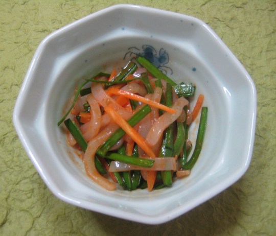 翌日、イカをさばいて早速、試してみました。あり合わせの野菜とイカを刻んでチョコチュジャンを振りかけ、こちょこちょっと混ぜるだけで出来上がりです。