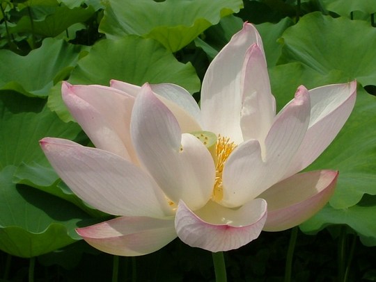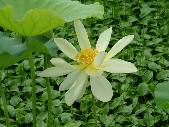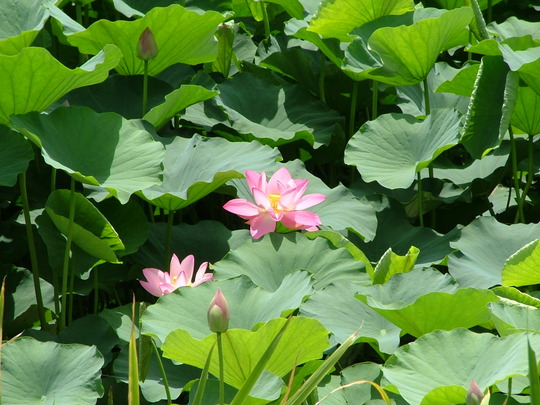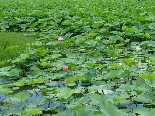 そこで、そろそろ見ごろを迎えるのでは、と期待して出かけたのですが…。僕は性来せっかちな人間なのでしょうか、烏丸半島の群生地についてみると、花はパラパラとしか咲いていません。ハスは夜明け前からゆっくりと開花し始め、朝にはしっかりと花を開きますが昼を過ぎると花を閉じ始めます。それを知っていたので、ちゃんと午前中に到着したのですが、ちょっと時期が早かったようですね。