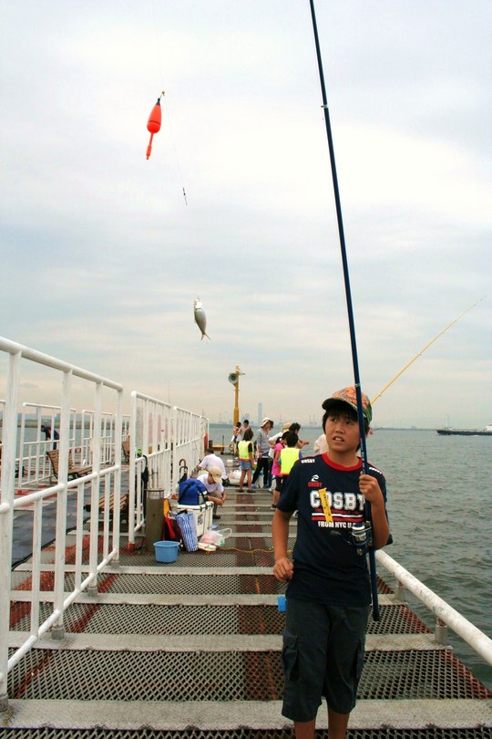 カメラ片手に魚つり公園へ着いたのが午前7時。夏休みとあって、すでに釣り桟橋は家族連れでいっぱいでした。