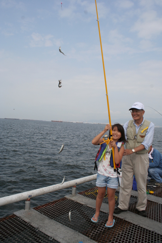 釣り桟橋の中ほどでサビキ釣りをしていたのが、おじいさんに連れられてやってきた西宮市の星加涼史君と葵衣ちゃんの兄妹でした。