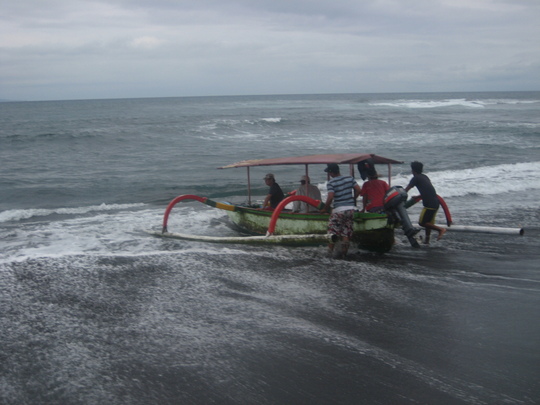 ロンポク海峡に面したルビー海岸は、黒砂でおおわれた広大な海岸で、どこまでも砂浜が広がっており、港一つありません。ですから釣りに出るときは、我々が先にカヌーに乗り込み、波打ち際までカヌーを寄せておいて、引き波を利用して沖へと漕ぎだすのですが、そのタイミングが難しく、波が小さいと失敗するので待つことしばし…といった塩梅です。