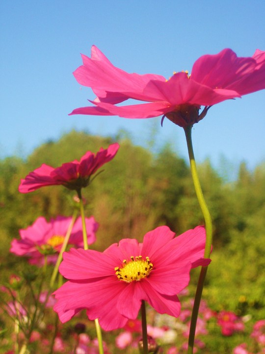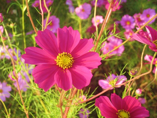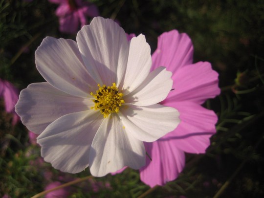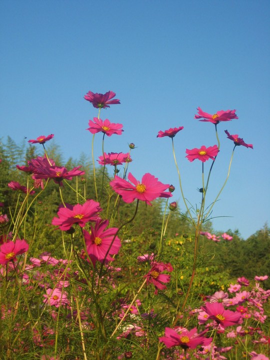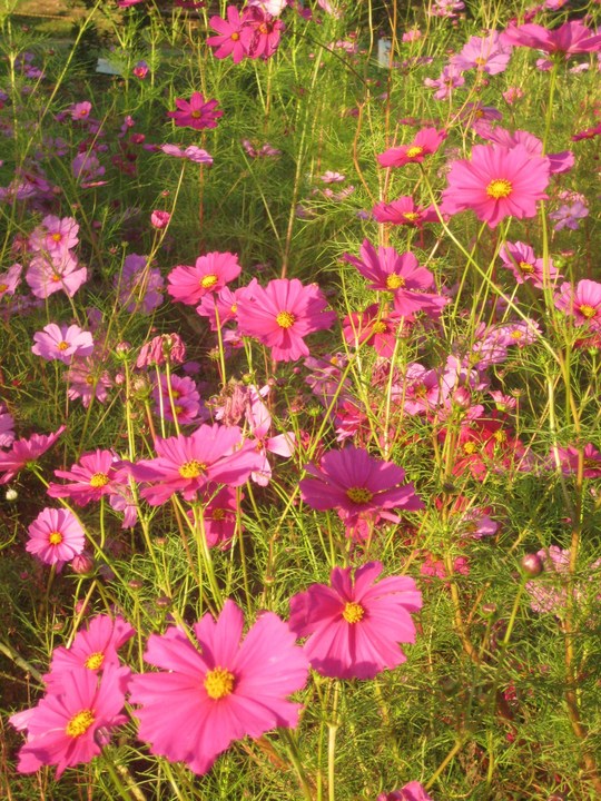 秋桜、つまりコスモスは、キク科の一年草。原産地はメキシコだそうです。花言葉は、赤が調和、白が純潔、優美。