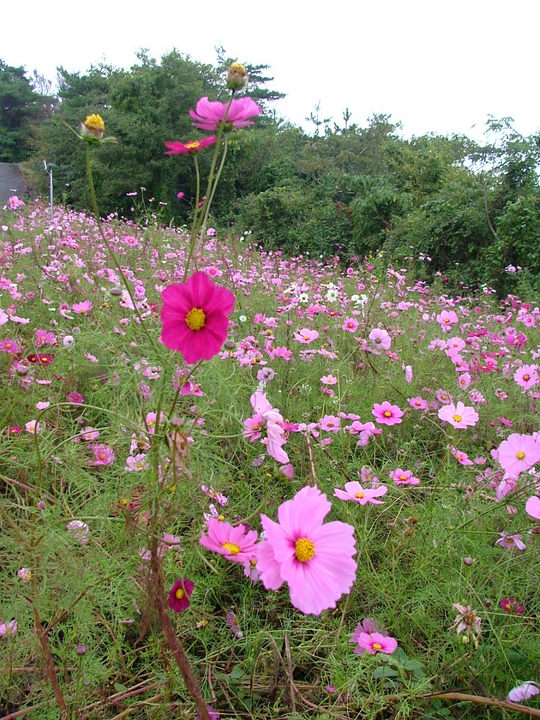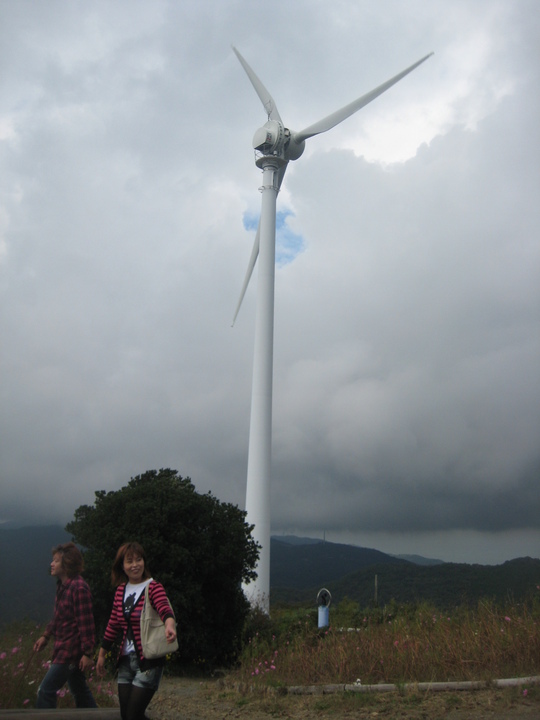 山頂には、風力発電用の大きな風車がそそり立ち、その周りは赤やピンク、可憐な白のコスモスが咲き乱れる公園になっています。