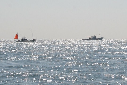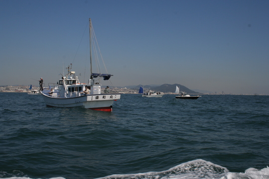 二見と本荘の人工島の間からエサ釣りのスタートです。ところがたくさんの船が右往左往するだけで、肝心のコノシロの群れが見つかりません。また、見つけてもすぐに消えてしまうので、引っ掛けようがないのです。