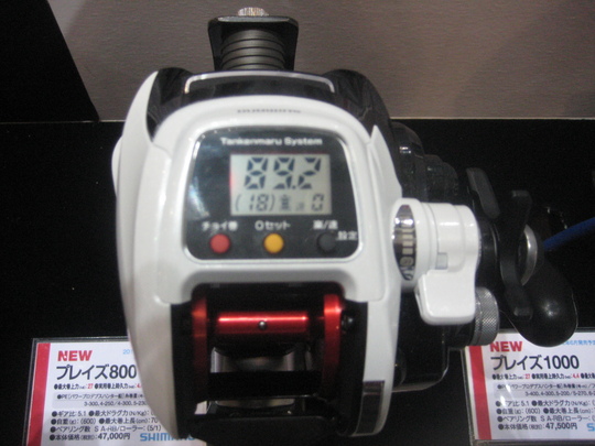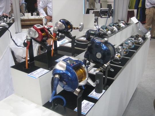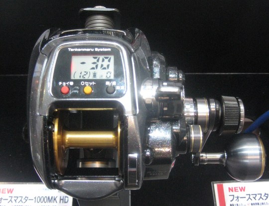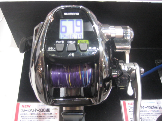 金曜日は開場をうろうろ、土曜と日曜日はずっとシマノブースに詰め切りでした。シマノの今年の目玉は、やはり、スタイルを一新、さらに性能も向上させた電動リールの登場です。フォースマスターに3000MKが登場したのをはじめ、従来の1000MKシリーズにハンドルをわずかに逆転させるだけでドラグが緩むというラピッドファイアハンドルドラグシステムを搭載した1000MKHDが加わりました。
